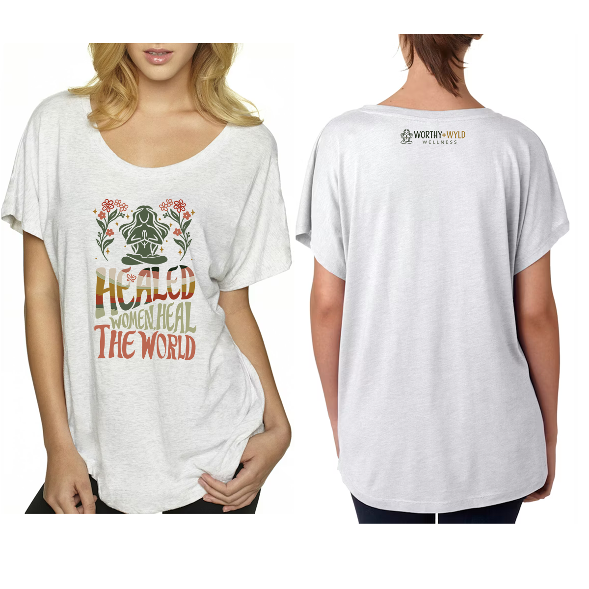 Healed Women Heal the World – Women's Shirt This isn’t just a shirt, it’s a statement. Featuring bold front and back prints, our Healed Women Heal the World design is a daily reminder of the ripple effect healing can create. Made by us in the USA and printed on a 50% Polyester, 25% Cotton, 25% Rayon, shirt. Front + back DTF print Designed and made with care in the USA Wear your healing. Spread the message. Let the world feel your impact.